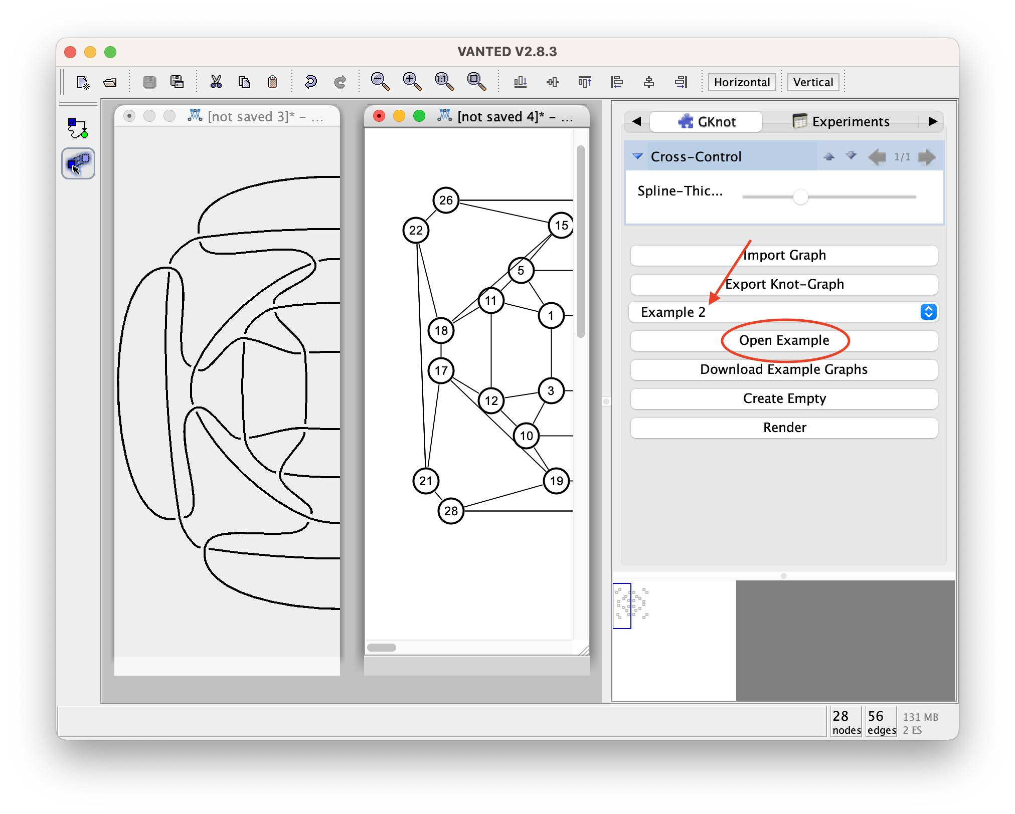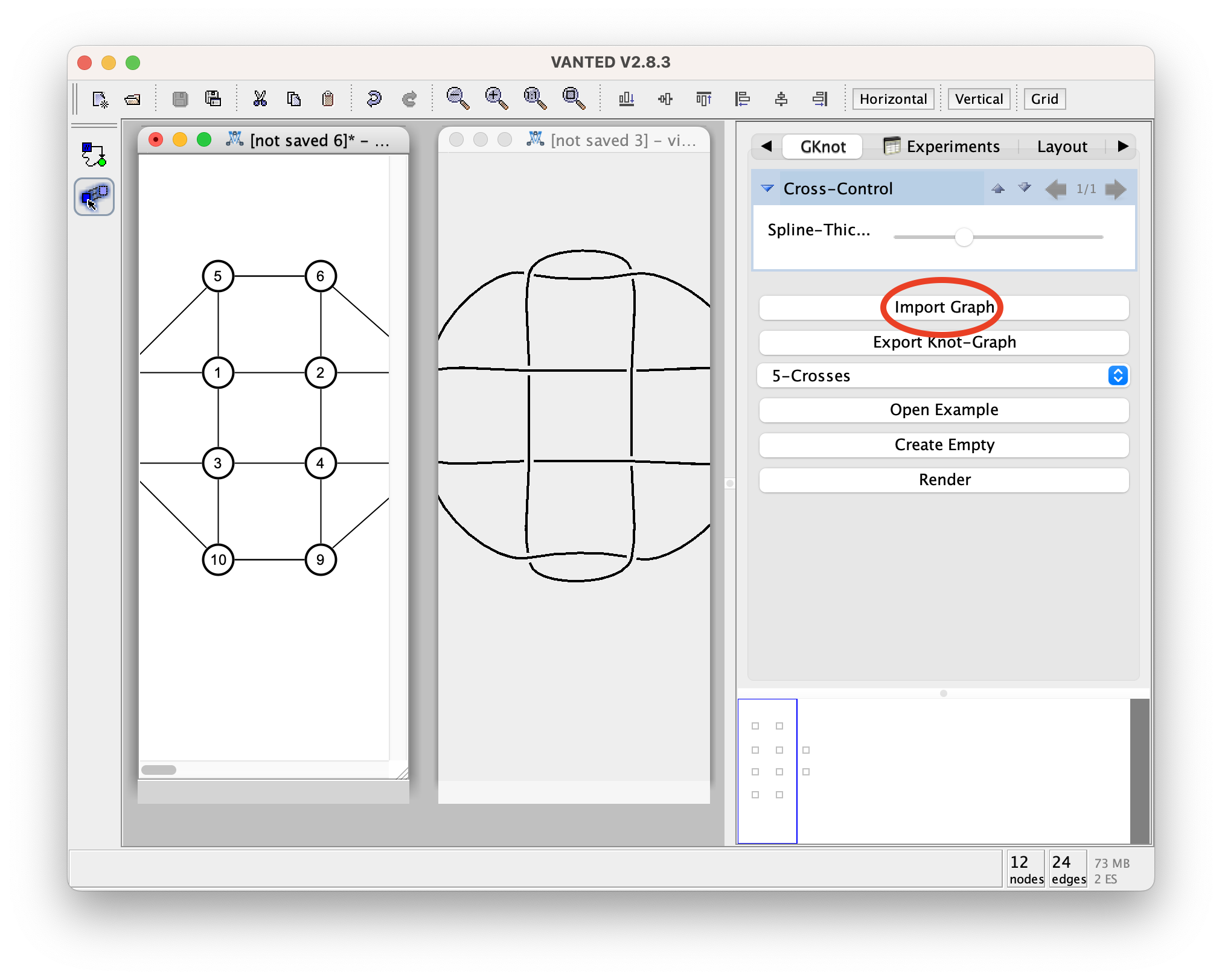 To change the style of the graph (knot graph) you may either interact with the nodes, or directly with the derived visualization via the crosses.